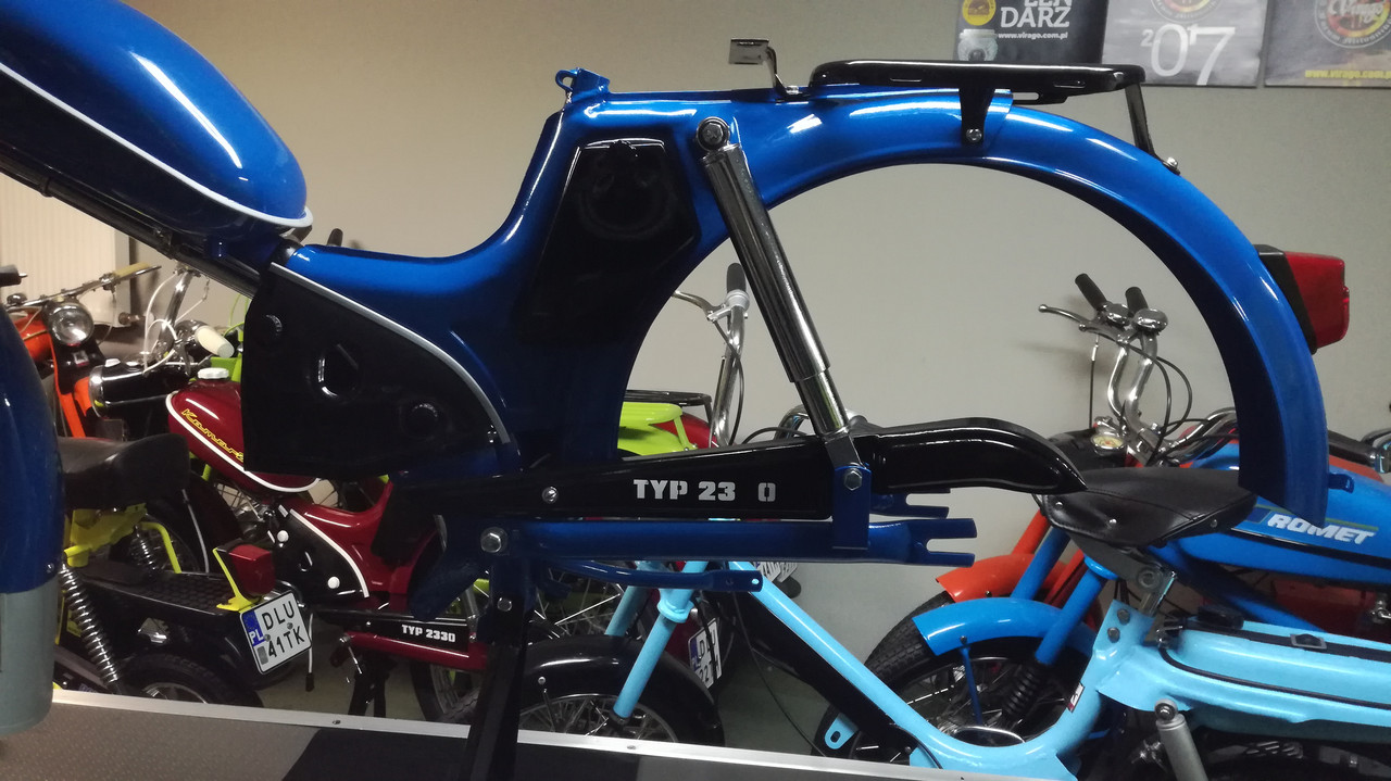 Tylna lampa. To u Grzegorza taką znalazłem i od razu był pomysł, aby dać ten klosz do tego Robaka. Po pierwsze idealny do tego rocznika z logo POLMO, no i biały odblask.